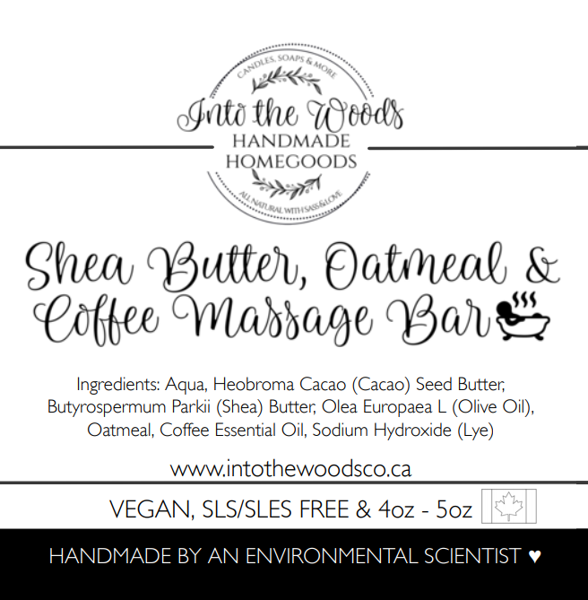 Ingredients: Aqua, Theobroma Cacao (Cocoa Butter), Butyrospermum Parkii (Shea Butter), Cocos Nucifera (Coconut Oil), Olea Europaea L (Olive Oil), Oatmeal, Coffee Essential Oil, Sodium Hydroxide (Lye) when mixed with oils or fats creates the chemical reaction, called saponification.